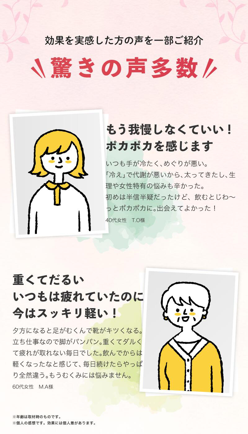 《摂取上のご注意》 〇本品は、多量摂取により疾病が治癒したり、より健康が増進するものではありません。〇本品は、疾病の診断、治療、予防を目的としたものではありません。 〇本品は、疾病に罹患している者、未成年者、妊産婦(妊娠を計画している者を含む。)及び授乳婦を対象に開発された食品ではありません。 〇疾病に罹患している場合は医師に、医薬品を服用している場合は医師、薬剤師に相談してください。 〇体調に異変を感じた際は、速やかに摂取を中止し、医師に相談してください。 〇時間が経ってもむくみが回復しない(一過性ではない)、脚以外の部位がむくむ、左右で症状に差がある、その他体に異常がある場合は、医師の診察をお勧めします。 |