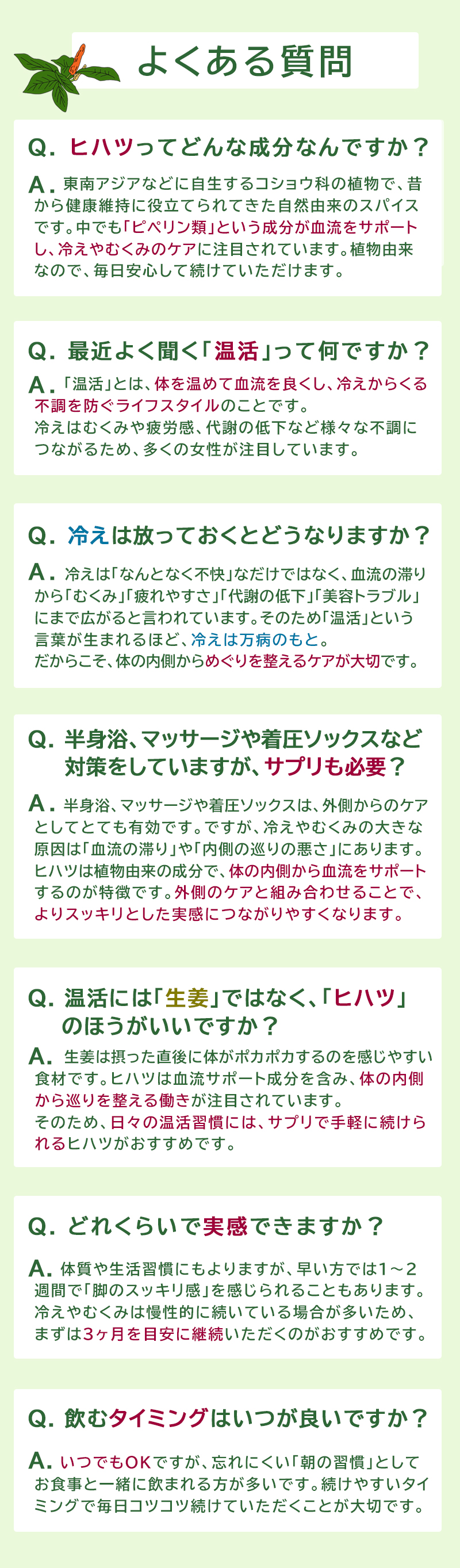 「冷え」は万病のもと…。本来、身体には体温を維持して温める機能が備わっています。 ですが、慢性的に冷えを感じる場合、その機能が乱れているかもしれません。 「冷え」放っておくと思わぬ不調があらわれることがあります。そこで、寒い季節 はもちろんですが、夏場の冷房など「手足の冷え」「足のむくみ」にお悩みの方にぜひ飲んで欲しい注目の自然由来ハーブ「ヒハツ」です。※ヒハツ由来ピぺリン類が含まれます。脚のむくみが気になる健常な女性の夕方の脚のむくみ(病的ではない一過性のむくみ)を軽減する機能があること