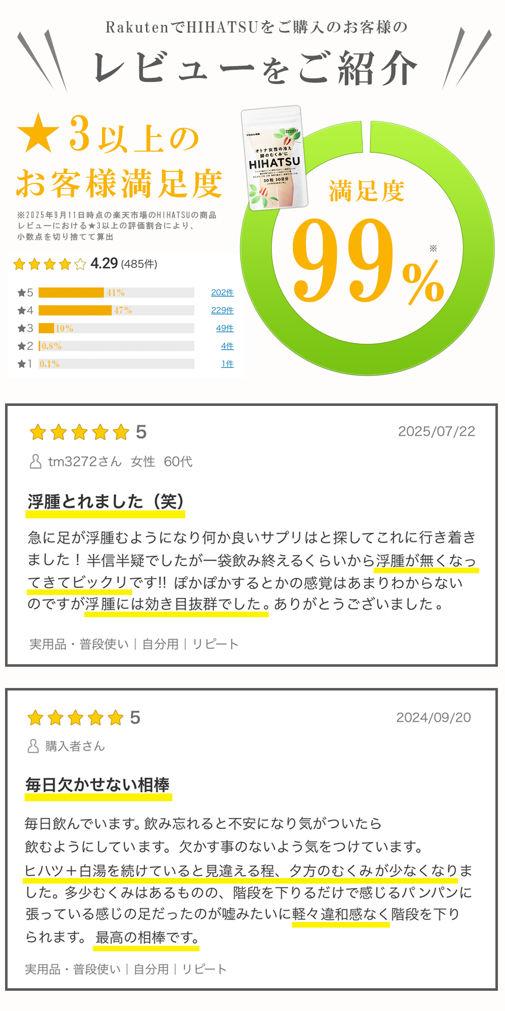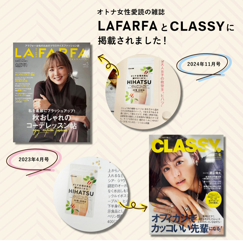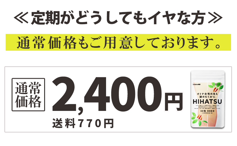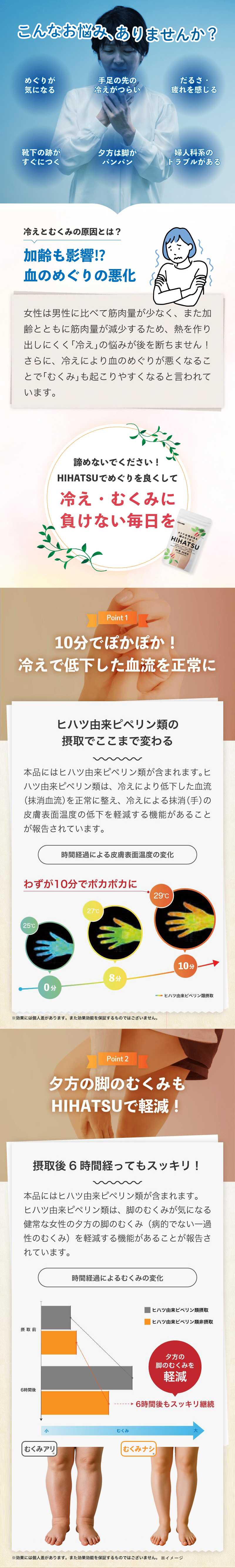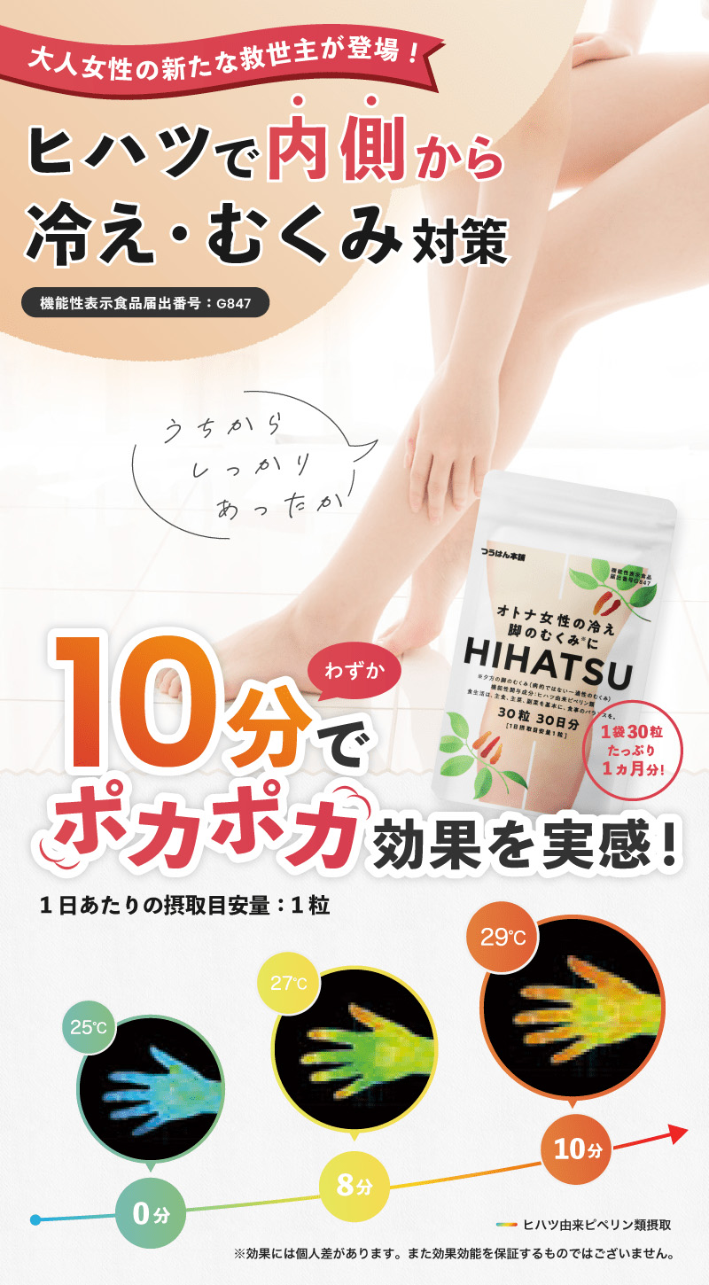 | 商品名 | 【機能性表示食品|届出番号G847】オトナ女性の冷え・脚のむくみにHIHATSU(ヒハツ)
